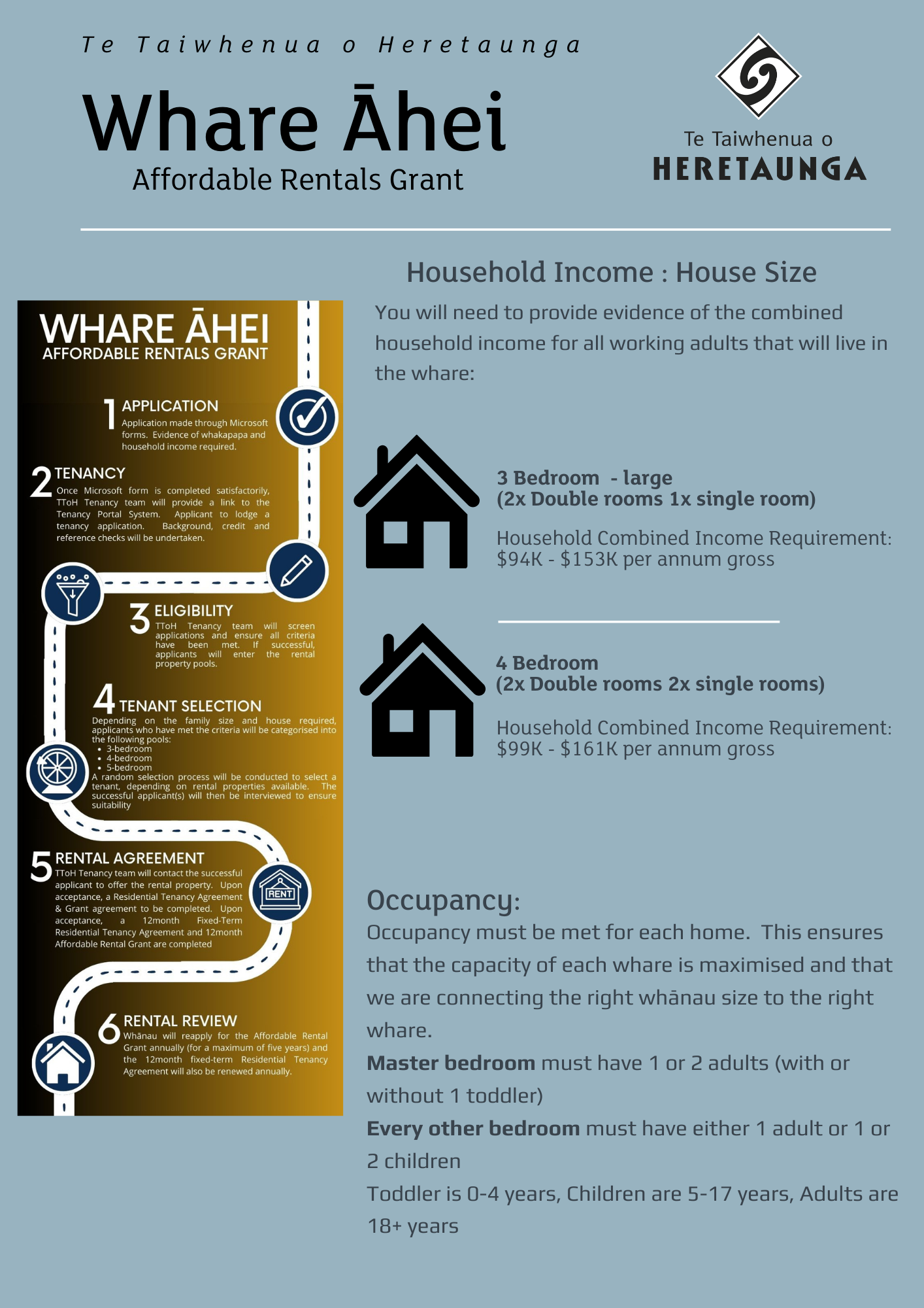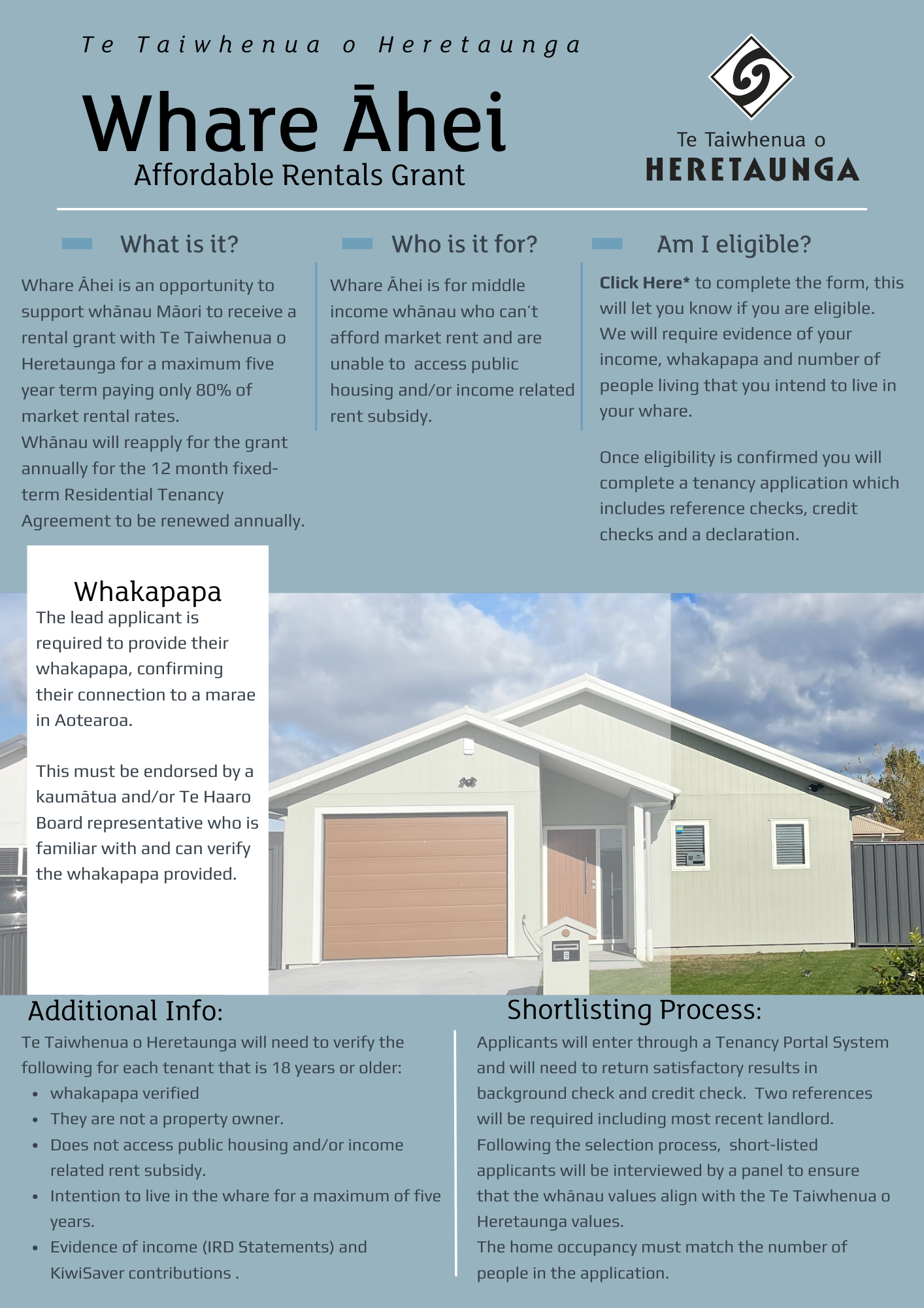 Whare Āhei is for middle income whānau who can’t afford market rent and are unable to access public housing and/or income related rent subsidy.  The rental subsidy grant will allow whānau an opportunity to pay 80% market rent with the aim to saving for their own home to purchase at the end of the five year rental agreement. Whānau will reapply for the grant annually for the 12 month fixed-term Residential Tenancy Agreement to be renewed annually.